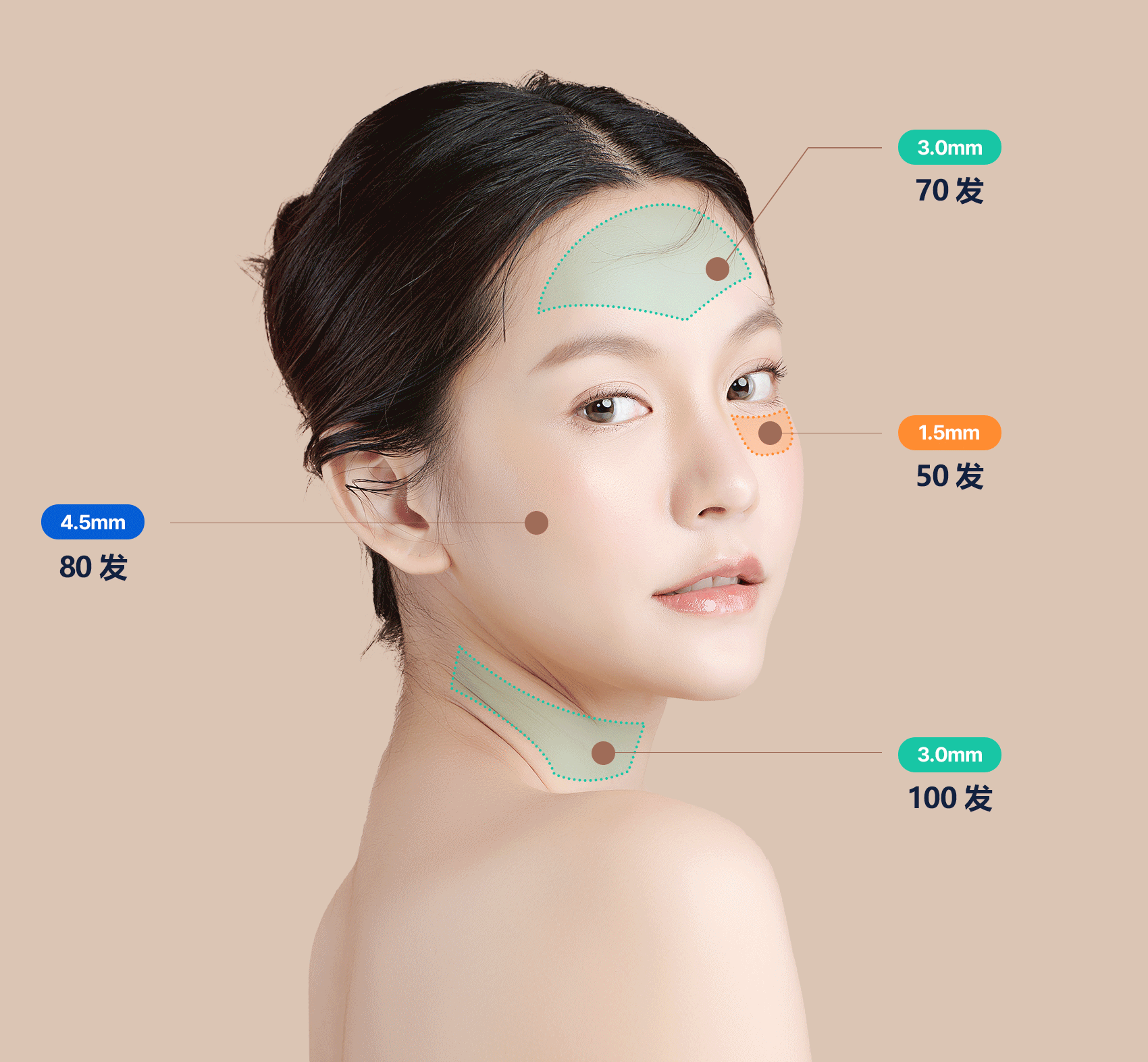 根据面部轮廓与皮肤厚度,进行个性化设计Ulthera能精准作用于从真皮层至SMAS筋膜层, 为您提供专属定制的超声波提拉解决方案。可针对目标部位进行精准、有效的改善。